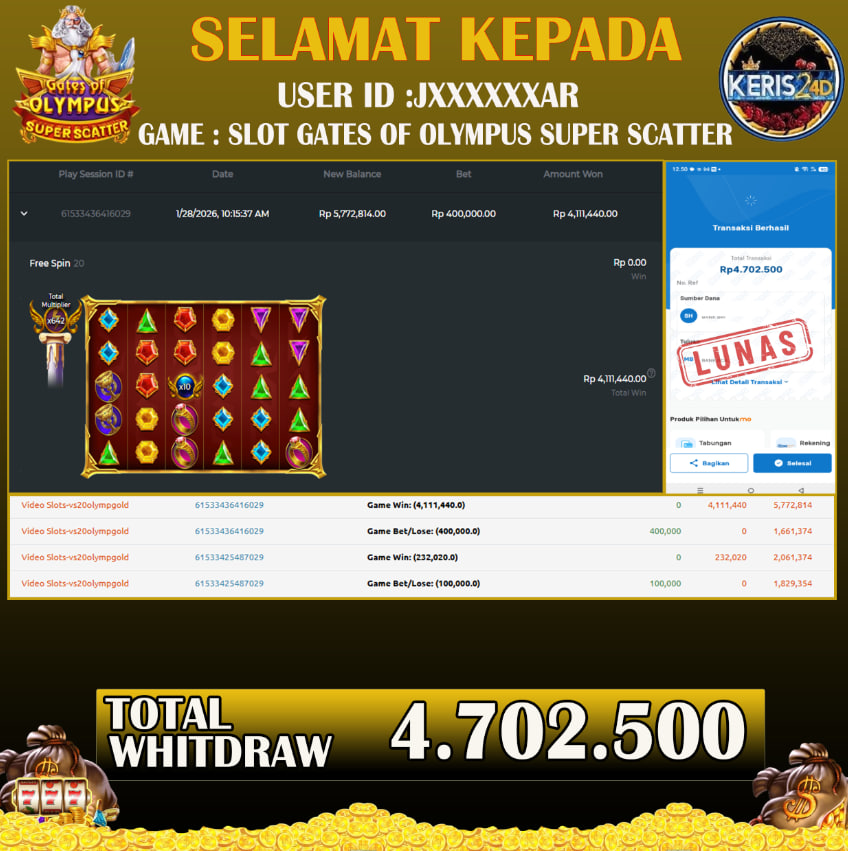 KERIS24D dikenal sebagai situs terpercaya yang selalu menghadirkan pengalaman bermain slot online yang aman, fair, dan berlisensi resmi. Di sini, kami tidak hanya sekadar memberikan janji, tapi bukti nyata berupa slip kemenangan yang dapat Anda lihat secara langsung.