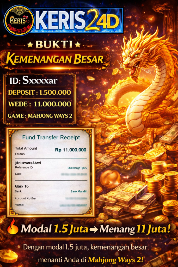 Setiap hari, member KERIS24D berhasil meraih jackpot besar dari berbagai provider slot ternama yang kami sediakan, seperti Pragmatic Play, Habanero, PG Soft, dan masih banyak lagi. Kami secara rutin menampilkan bukti screenshot atau rekapan kemenangan yang berhasil diraih, mulai dari kemenangan ratusan ribu hingga puluhan juta rupiah. Semua slip kemenangan ini kami hadirkan untuk membuktikan bahwa di KERIS24D, peluang menang itu nyata.