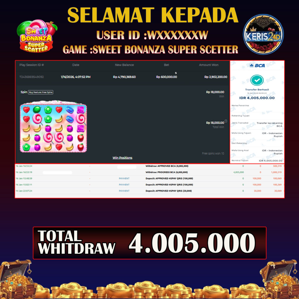 JACKPOT SLOT Sweet Bonanza Super Scatter 16 JANUARI 2026, Jackpot Slot Gacor, Kemenangan Slot, Bukti Kemenangan Slot, Kemenangan Slot PgSoft, Menang Slot online, Slot Gacor, Situs Aman Terpercaya, WD Berapapun Pasti DI Bayar Tuntas, Maxwin Slot Online.